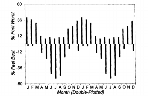 One study found that patients with the eating disorder Bulimia Nervosa had marked seasonal patterns in symptoms, with 35% showing worsening symptoms and 28% of the participants meeting the criteria for a winter SAD diagnosis (Lam et al., 1996). The figures below describe the changes in mood and binge/purge behaviours by month.